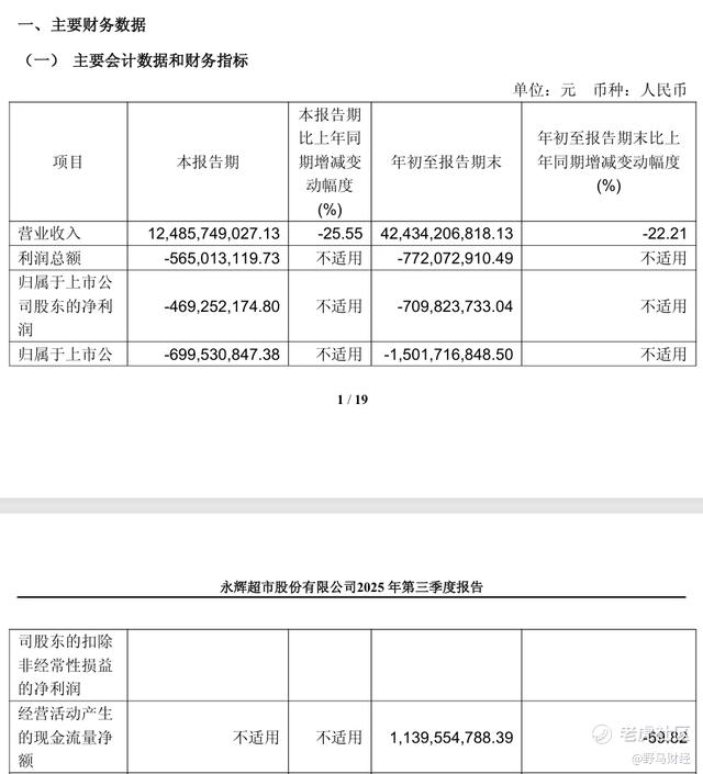 永辉超市2025年三季报显示,公司第三季度营收约124.86亿元,同比减少25.55%;归母净利润亏损约4.69亿元;前三季度营收约424.34亿元,归母净利润亏损约7.1亿元。经营活动产生的现金流净额约为11.4亿元,同比减少69.82%。