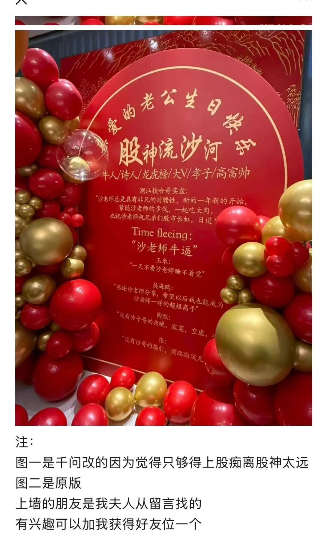 5 、还有一个爱情是一线游资流沙河过生,牛市了,柚子赚钱了,流沙河的公众号图片显示,流沙河的妻子高喊股神、牛人、诗人、龙虎榜、大v、孝子、高富帅,感谢老公,虽然流沙河作为柚子很多人被割韭菜,但这个市场中正如主席说的需要国家队也需要短线柚子,人家没离婚 ,就是最大的道德。