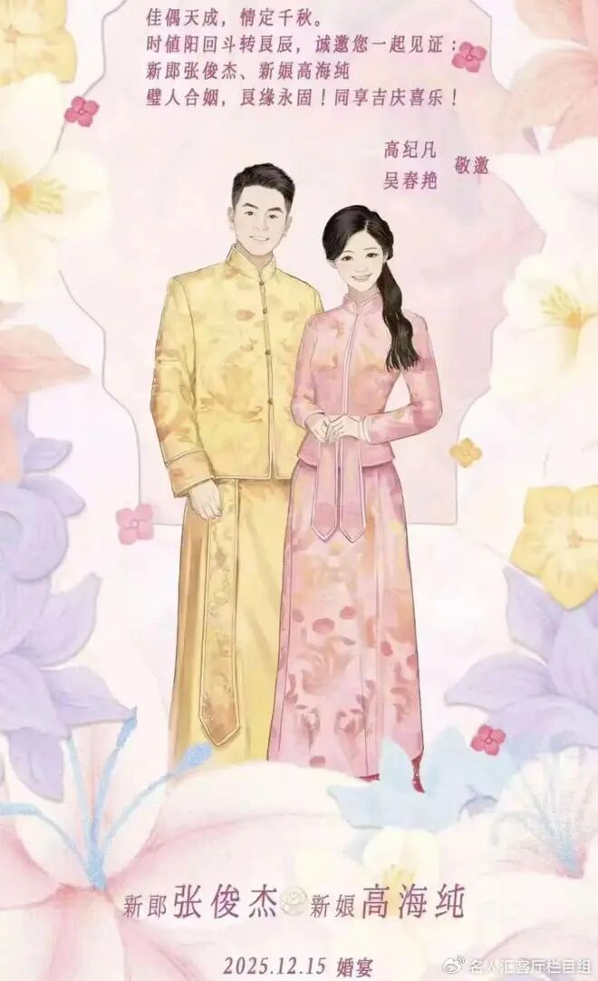 1 、第一是霸王茶姬董事长和天合光能董事长喜结连理,网上流出的请柬文字部分写道 “佳偶天成,情定千秋。时值阳回斗转良辰,诚邀您一起见证:新郎张俊杰、新娘高海纯璧人合姻,良缘永固!同享吉庆喜乐!”,并由高纪凡、吴春艳敬邀,明确了婚宴时间为 2025 年 12 月 15 日,体现出这场婚礼的庄重与喜庆,也表明了新人的身份以及邀请宾客见证幸福时刻的诚意。