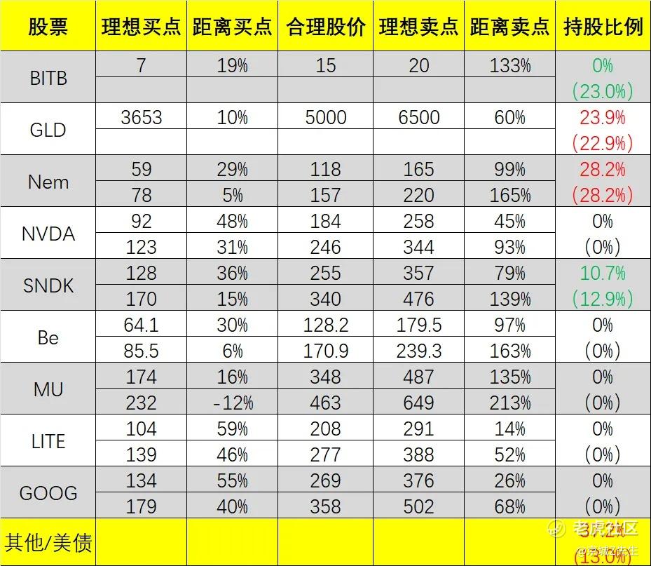 SNDK 10.7%,NEM 28.2%,GLD 23.9%,现金/美债 37.2%。