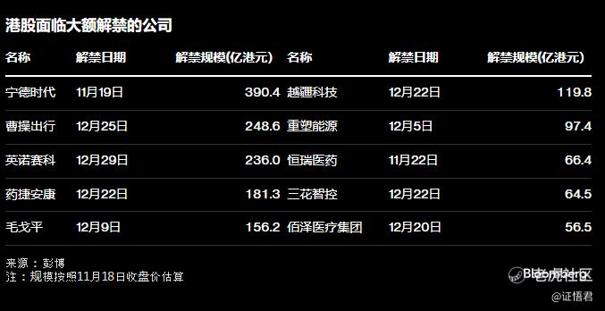 再说新股,次新股, $创新实业(02788)$ Allin了,也提前通知了,暗盘不错,涨了20%,走了。量化派肯定能涨,但最后如果认购超过5000倍,我就不打了,省认购费。上周宁德时代解禁后立刻大跌,港股对A股溢价迅速收敛到14.8%。市场开始担忧抽水,按彭博汇总数据显示,到年底还有28家公司解禁,规模约1900亿港币。包括曹操出行,英诺赛科,恒瑞医药,三花智控等。涨得多的面临回调压力是事实,但很多人忽略了港股是增量市场,A股是存量市场。存量市场最怕新上市的数量多了吸干流动性,增量市场最怕新上市的质量差了吸不来流动性。从这个角度观察,笔者看好A股核心资产来港上市。不患无水,患所以立;不患莫己知,求为可知也。说人话,就是利好港交所。