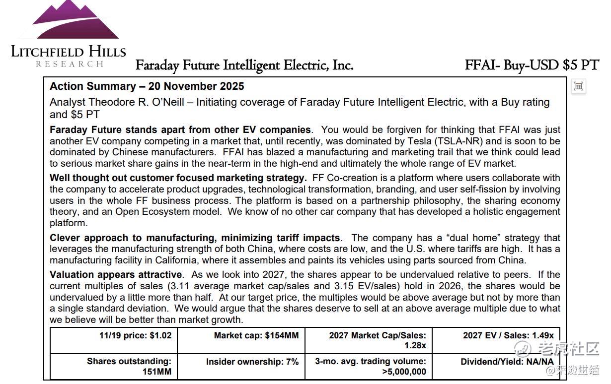$Faraday Future Intelligent Electric Inc(FFAI)$ Faraday Future(股票代码FFAI,简称FF)是否被严重低估?华尔街独立研究机构 Litchfield Hills Research日前发布了对FF的研究报告,认为FF当前股价与市值均处于“明显低估”状态,给予FF“买入”评级,目标价5美元。