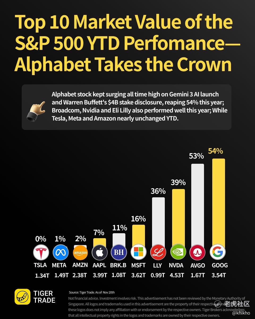 今天老虎证券推送的一张图,很有意思,很直观的给大家展示了“七巨头”与 $标普500(.SPX)$ 市值Top10的“裂变”。看似只是一张“YTD涨跌+市值”排行榜,其实,已经把2025年美股的核心叙事一次性压成了一张“X光片”,牛 👍