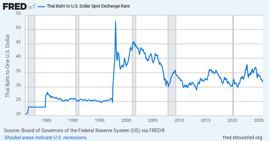 注:1997年,泰国央行耗尽外汇储备,无法守住泰铢币值,泰铢兑美元汇率从1:25暴跌至1:50。