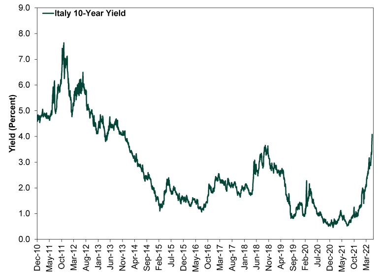 注:2011年,意大利主权国债收益率从4%迅速攀升至7.5%,后来在欧洲央行行长德拉吉一句Whatever it takes后,危机平息,国债收益率逐步回复到低水平。