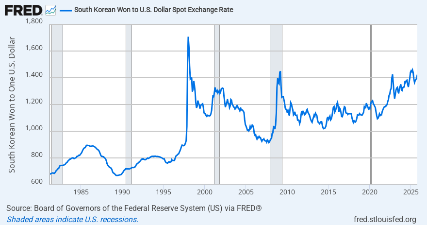 注:1997年,韩元兑美元汇率从1:900左右迅速大跌至1:1600。