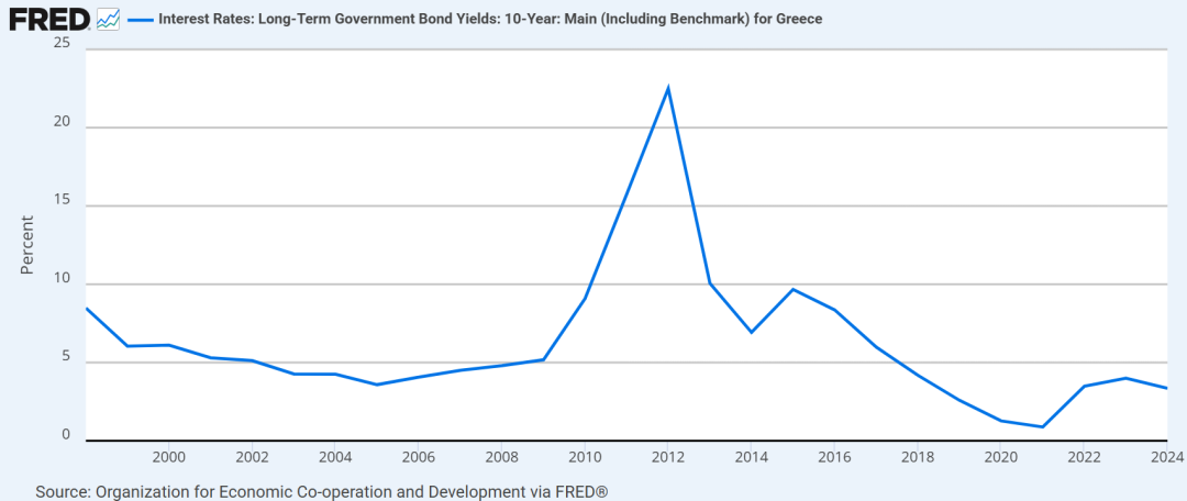 葡萄牙在同一时期也经历类似困境。2000年后葡萄牙经济增长几乎停滞,财政赤字长期存在。2011年葡萄牙十年期国债收益率突破12%,政府失去市场融资能力,被迫申请780亿欧元的救助。