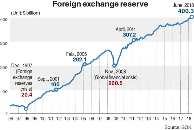 注:在经历了1997年亚洲金融危机后,韩国的外汇储备稳步上升,因此在2008年金融危机时得以游刃有余。