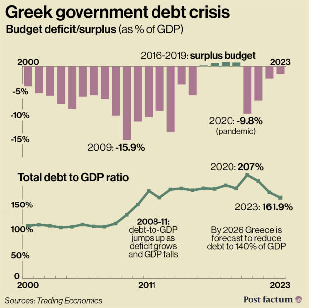 这个过程通常发生在繁荣时期,因为繁荣让所有参与者都相信未来会比现在更好,从而愿意借更多的钱。希腊是一个典型例子。自从2001年加入欧元区后,希腊政府债券的收益率迅速下降,从8%降至与与德国几乎一致的水平(4%左右)。