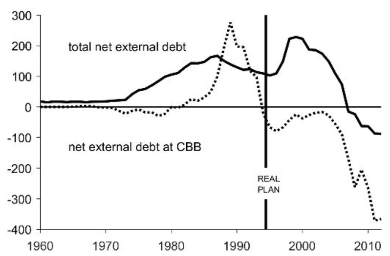 注:1980年代,巴西的净外债(上图虚线)迅速攀升,到1985年时突破1000亿美元。