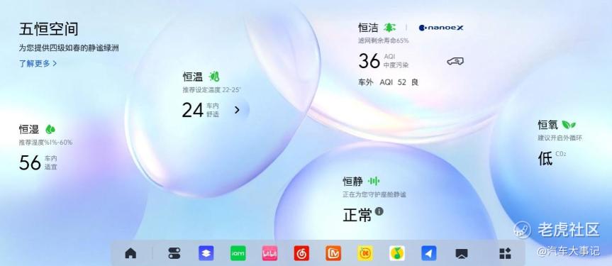 恒温:至境世家采用双层流、多温区空调,实现分区送风,专流专用:上层气流输送新风,保证呼吸品质,脚部区域调节温度确保体感舒适。空调系统还能识别不同季节,智能推荐乘客最佳的温度设定范围。