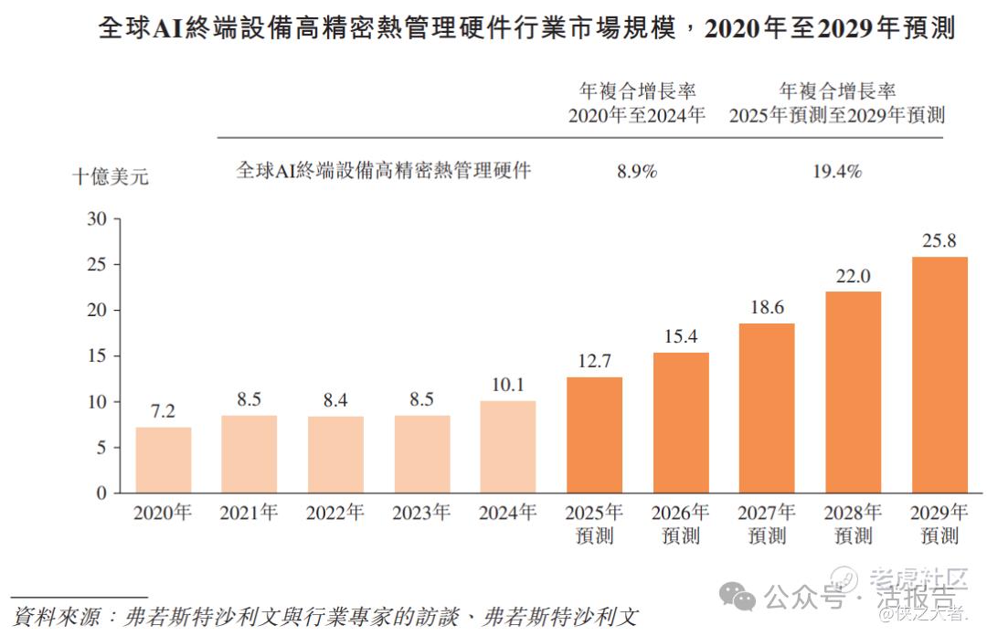 从2020年到2024年,全球AI终端设备高精密热管理硬件的市场规模从72亿美元增长到101亿美元,预计市场规模将从2025年的127亿美元增加到2029年的258亿美元。