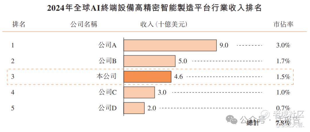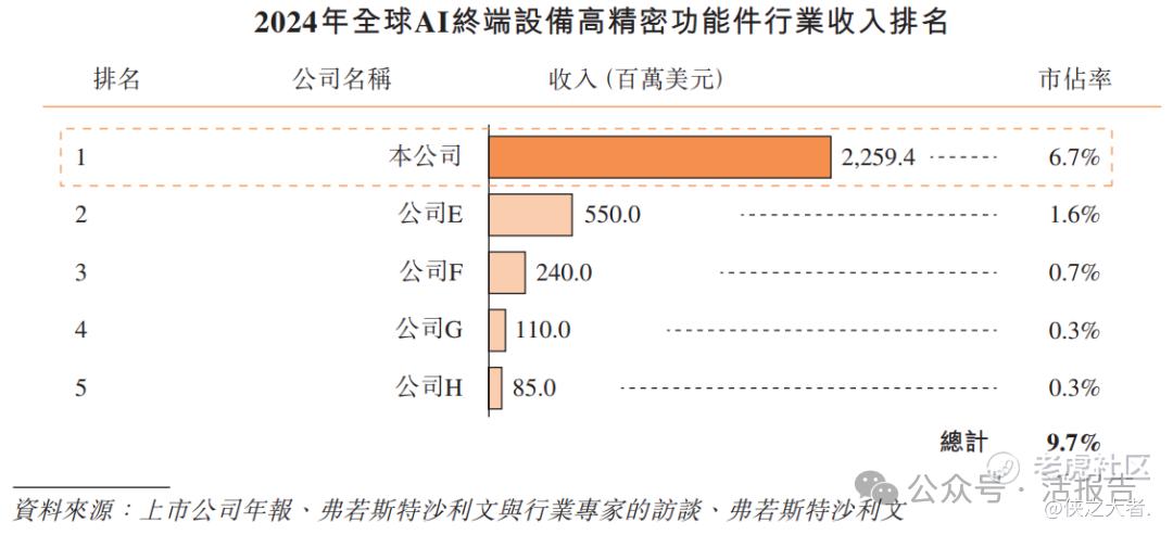 根据弗若斯特沙利文资料,以2024年收入计,公司在全球AI终端设备高精密功能件市场行业中排名第一,在全球AI终端设备高精密智能制造平台行业中排名第三。