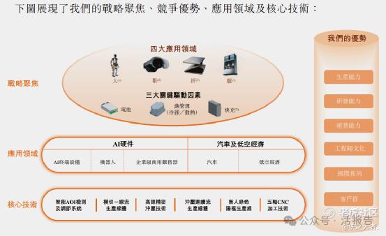 公司是全球领先的AI硬件智能制造平台,致力于为全球客户提供一站式智能制造服务及解决方案。公司打造了覆盖从核心材料、精密功能件、模组到精品组装的全链条产品矩阵,广泛应用于AI硬件(涵盖AI终端设备、机器人及企业级商用服务器)、汽车以及低空经济等核心前沿领域。