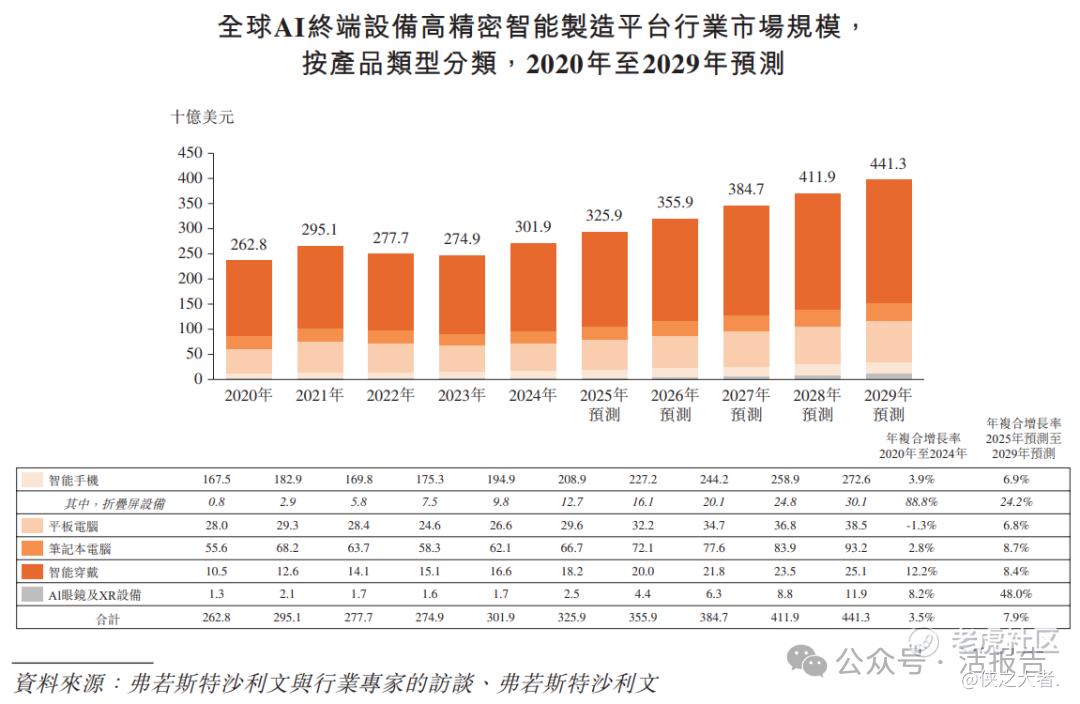 根据弗若斯特沙利文(Frost & Sullivan)的报告,从2020年到2024年,全球AI终端设备高精密智能制造平台行业的市场规模从2,628亿美元增长到3,019亿美元;预计从2025年到2029年,市场规模将从3,259亿美元增长到4,413亿美元。