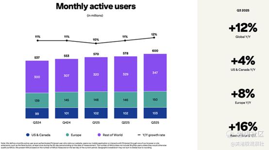 我们需要重点关注的是Pinterest的月活跃用户增长情况,尤其是在营收贡献最关键的区域——美国和加拿大地区。尽管北美市场4%的用户同比增速,远低于全球12%的增速(主要由其他地区16%的高增长推动),但北美地区贡献了Pinterest超过四分之三的营收,其用户基数的稳步扩大对公司长期营收增长至关重要。