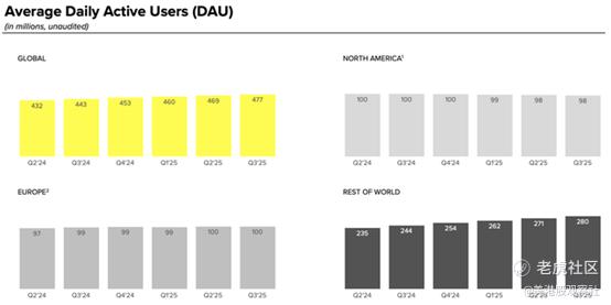 与同行相比,Pinterest的用户表现更具优势。以Snap为例(见下图),尽管Snap披露的是日活跃用户,与Pinterest的月活跃用户并非完全可比指标,但仍能看出明显差异:Snap在美国市场的用户扩张乏力,其北美地区日活跃用户已降至9800万,同比下降2%,且自今年年初以来持续下滑。