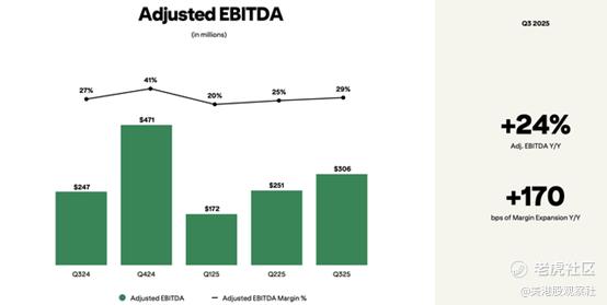 尽管面临上述挑战,Pinterest仍实现了稳健的调整后EBITDA增长:第三季度调整后EBITDA同比增长24%,达到3.06亿美元,利润率为29%,较去年同期提升170个基点(即1.7个百分点)。