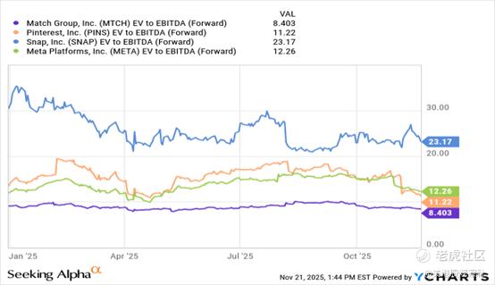 据此计算,Pinterest当前的企业价值对应2026财年调整后EBITDA的倍数仅为9.8倍。如下图表所示,在社交媒体领域,Pinterest的估值显著低于核心同行。唯一估值更低的是约会应用巨头Match,但Match面临营收持平的问题,与Pinterest虽增速放缓但仍保持两位数增长的情况并不具备直接可比性。