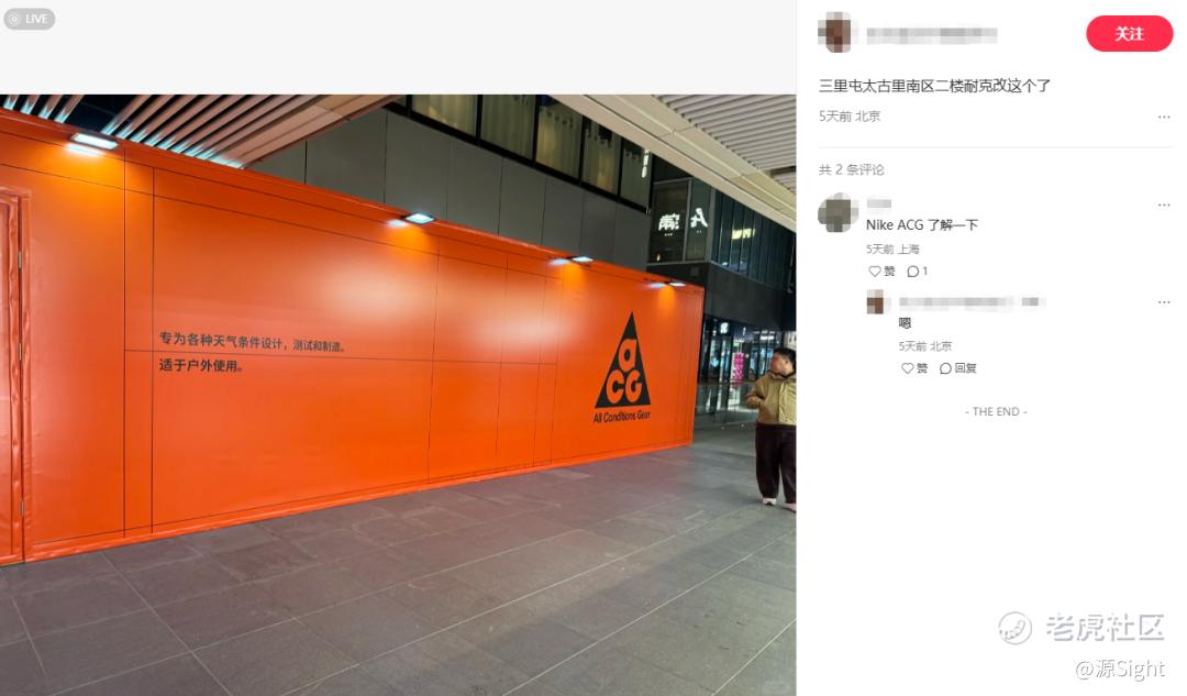 软性营销外,耐克策划已久的子品牌ACG(All Conditions Gear)终于正式在北京三里屯太古里南区竖起围挡,这将是耐克ACG在中国的第一家门店。