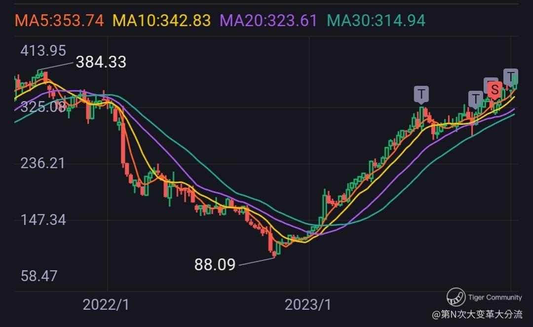 之后的事,过来人都印象深刻,Facebook股价在财报日之后一周,股价从310跌至约230美元。而且正巧又在3周后遇到了俄乌战争爆发,引爆通胀螺旋的概率攀升,美联储加息周期的预期延长,美股转入熊市,Facebook股价一路下跌,最低在2022年9月跌到88美元,属于膝盖斩,现金奶牛式的蓝筹股出现如此急跌过程,最近20年来实属罕见。当Meta摆脱熊市在2023年突破400美元之后,很多长线投资者都在为当初恐慌下卖飞Facebook(Meta)感到懊恼,深感当时在舆论氛围渲染下,自己的判断力也被其他人的群体主观意识遏制。