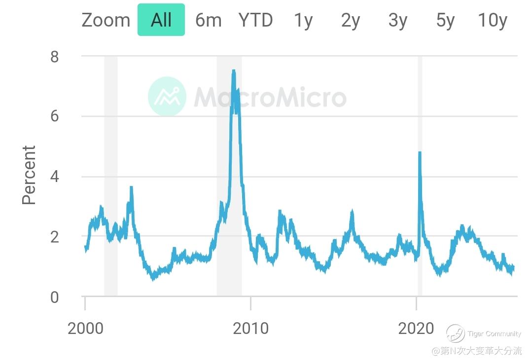 另外,从财会的角度思考,当下时间节点,美国国债利率与企业债利率的利差降到历史低位的1.4%。