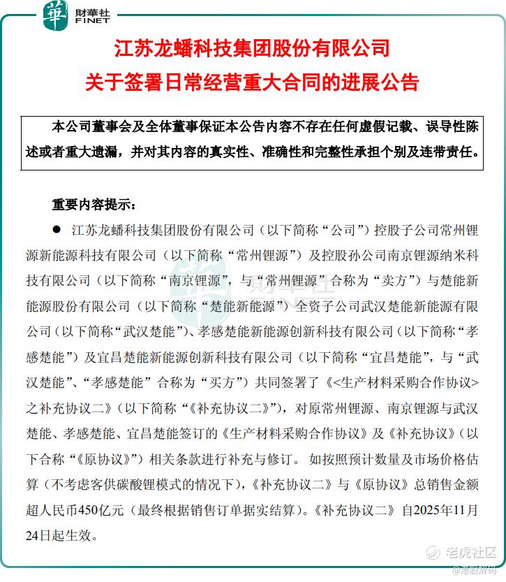 如按照预计数量及市场价格估算,《补充协议二》与《原协议》总销售金额超450亿元,《补充协议二》自2025年11月24日起生效。