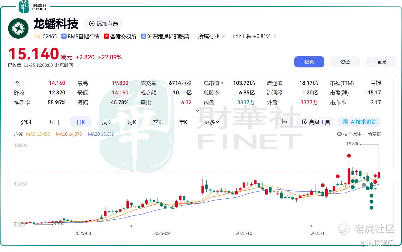 11月25日, $龙蟠科技(02465)$ 股价放量大涨,盘中一度涨逾60.7%,截至收盘涨幅仍有22.89%,报15.14港元/股。