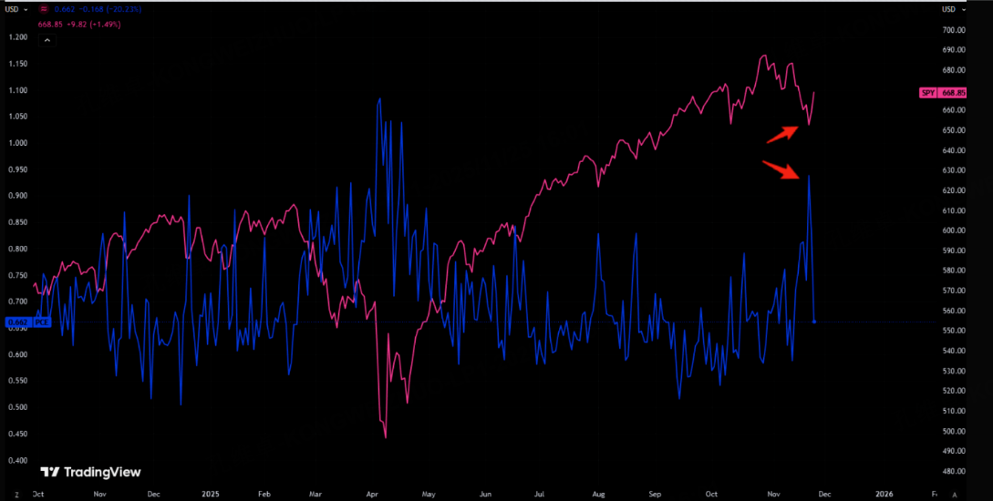 与此同时,看跌与看涨期权成交量之比(PCE)在上周抛售中飙升至今年4月以来的最高区间,表明这轮下跌在期权层面释放了高度的避险需求和对冲压力,并非“小打小闹”的技术回调。