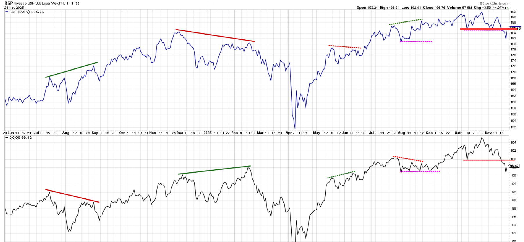 与之类似,代表纳指等权重表现的QQQE Direxion NASDAQ-100 Equal Weighted Index Shares 也出现破位迹象,这意味着即便部分超级权重股尚能支撑指数点位,更广泛的股票的真实状态仍偏空头。