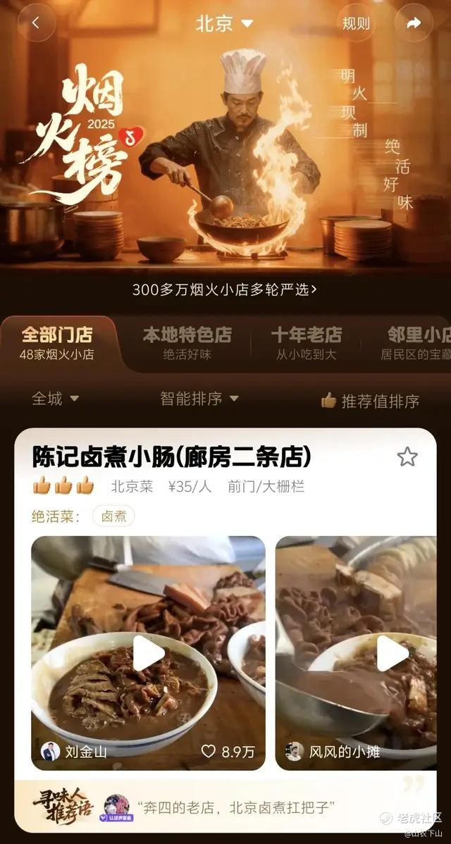 而抖音的逻辑是内容即曝光。不管是老板自己在灶台前支起手机做的直播,还是食客的分享视频,都可能触发同城推荐、兴趣推荐,并转化为线下流量,小店不需要为此额外支付成本。