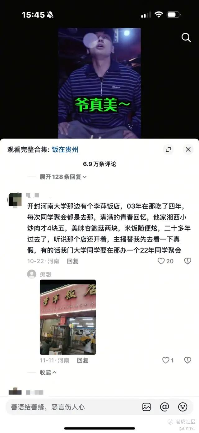 在“特别乌啦啦”的视频评论区里,网友“亿米八三”曾经留言请求他去探访河南大学门口的李萍饭店。那是“亿米八三”上大学时经常去的餐厅,如果还在,他打算去那里组织一场毕业22年的同学聚会。没过多久,有人用一张照片回复他,“李萍饭店”的门头招牌已经褪色,但还在正常经营中。