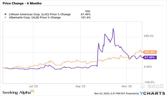 如下图表所示,尽管LAC通过与美国政府敲定协议已斩获不少上涨空间,但在此期间,其股价表现实际上落后于雅保。过去6个月,受锂价上涨推动,雅保股价涨幅已超100%,而LAC股价仅上涨67%。