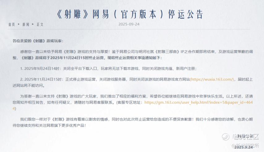 2025年11月24日15时,网易旗下金庸IP改编游戏《射雕》正式终止所有服务。这款曾高调宣称“要长线运营150年”的武侠大作,从全平台公测到彻底关服仅历时606天,巨大的承诺反差引发玩家与行业的广泛热议。