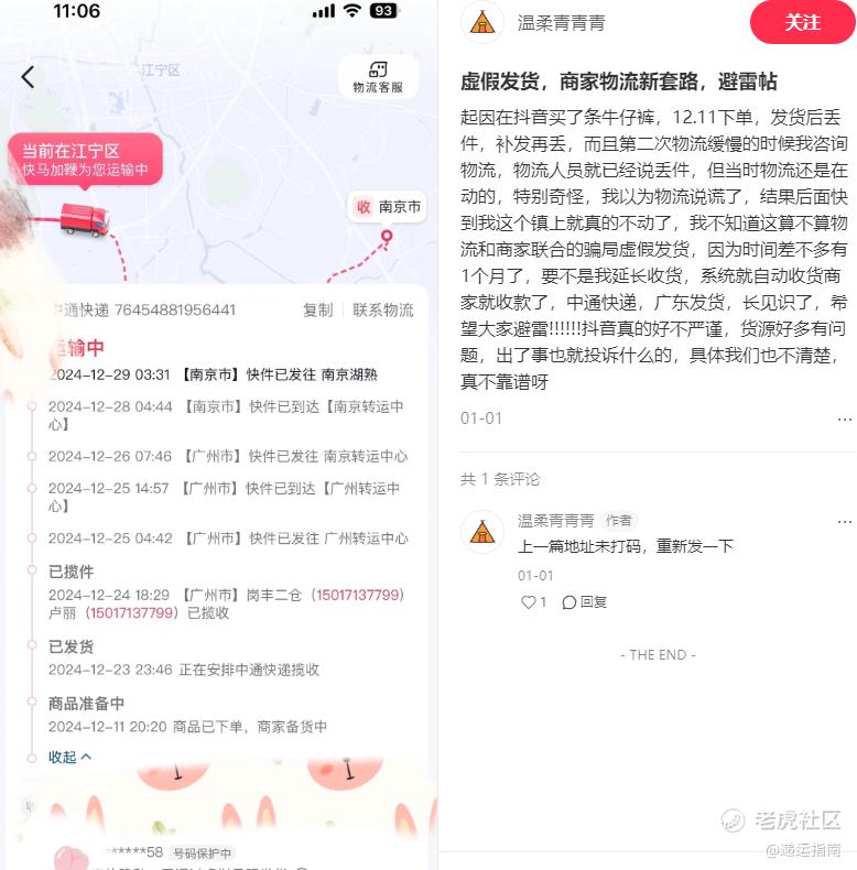 2025年1月1日,网友“温柔青青青”在小红书发帖表示,她在抖音购买的牛仔裤一波三折:第一次寄送就遭遇丢件,补发后又遭遇物流缓慢的情况。她主动联系物流客服询问进展,对方回复称“再次丢件”,但蹊跷的是,物流信息却仍在持续更新。