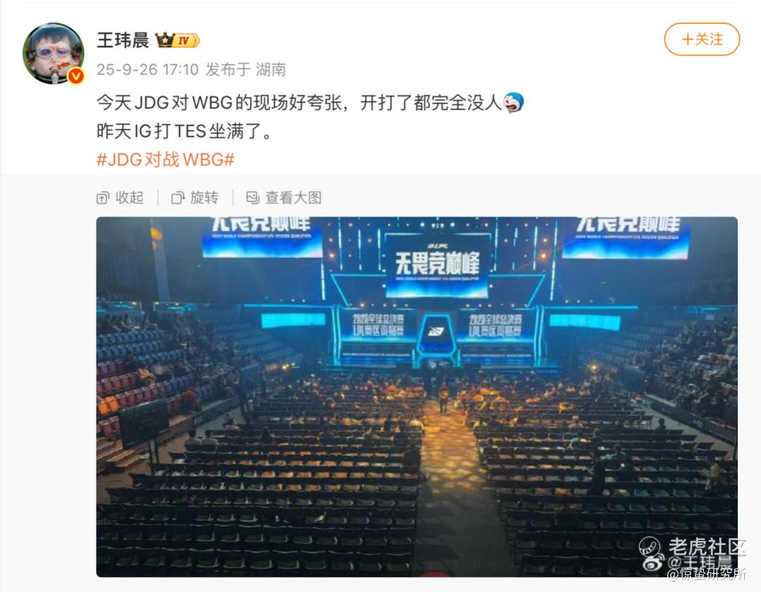 到了2025年常规赛阶段,除IG、TES、BLG、AL四支明星战队外,其余队伍的主场或联盟统一场馆均出现门票滞销。今年9月26日,JDG对战WBG的S15资格赛上,就有电竞博主发布现场观众稀稀拉拉的照片,并配文“开打了都完全没人。昨天IG打TES坐满了。”