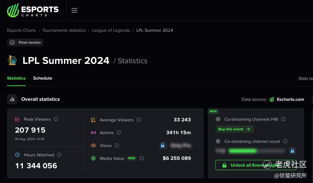 进入2024年后,LPL热度稍有回暖,但很快又呈现出颓势。据EsportChatrs官网数据显示,2023年LPL春季赛的观看人数峰值为20万人,夏季赛的观看人数峰值增长到28.8万人。在此基础上,2024年LPL春季赛的观看人数峰值达到了29万人,但这一数据在随后的夏季赛跌到20.8万人,几乎回到了2023年的低谷。