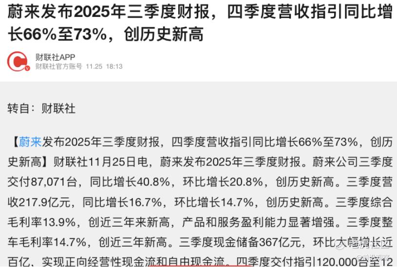 新能源车企的现金储备与现金流状况,始终是资本市场衡量其安全性的核心指标。蔚来Q3财报在这一维度的表现,无疑给投资者吃了颗定心丸——公司三季度营收达到217.9亿元,环比增长14.7%;三季度蔚来整车毛利率为14.7%,综合毛利率为13.9%;现金储备环比大幅增长近百亿亿元,达到367亿元;实现正向经营性现金流与自由现金流,自我造血能力正式成型。