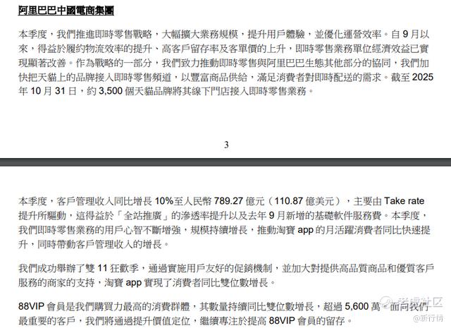 财报表示,截至2025年10月31日,已有约3500个天猫品牌将线下门店接入即时零售网络,渠道融合成效显著。在刚刚结束的天猫双11期间,淘宝APP消费者数量实现同比双位数增长,近600个品牌成交破亿;天猫品牌即时零售日均订单环比9月增长198%,成为驱动电商业务增长的新动能。