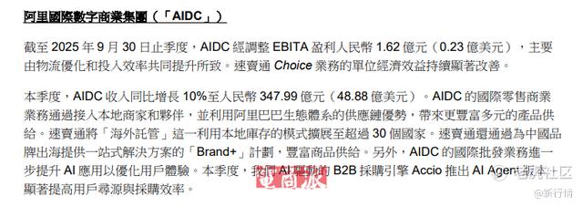 其次是AIDC,阿里国际数字商业集团(AIDC)本财季营收347.99亿元,同比增长10%,同时实现经调整EBITA盈利1.62亿元,盈利能力持续改善。