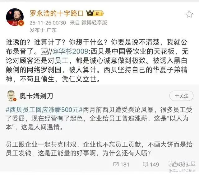 回溯事件脉络,矛盾的导火索始于华杉的一条评论。11月25日,华杉在社交平台发文力挺西贝,称其是 “中国餐饮业的天花板”,却同时暗指西贝此前陷入的预制菜舆论风波是 “被诱入黑白颠倒的网络罗刹国,被人算计”。这番表态瞬间点燃了罗永浩的怒火。要知道,2025年9月,正是罗永浩公开吐槽西贝 “菜品几乎全是预制菜且价格高”,引发全网对预制菜透明度的讨论,彼时华杉作为西贝合作十年的品牌顾问,就曾公开呼吁 “硬刚网络黑嘴”,双方的梁子早已埋下。