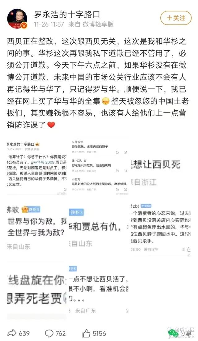 2025年11月26日,罗永浩一条 “最后通牒” 式的微博再次引爆舆论场。他明确要求华与华创始人华杉在当日下午六点前公开道歉,直言 “私下道歉已不管用”,甚至放出 “未来市场公关行业只记得罗与华” 的狠话,将这场原本隐藏在商业合作背后的矛盾彻底摆到了公众面前。有趣的是,此次风波与此前闹得沸沸扬扬的 “西贝预制菜之争” 虽有渊源,却被罗永浩特意切割:“西贝正在整改,这次跟西贝无关,只关乎我和华杉”。