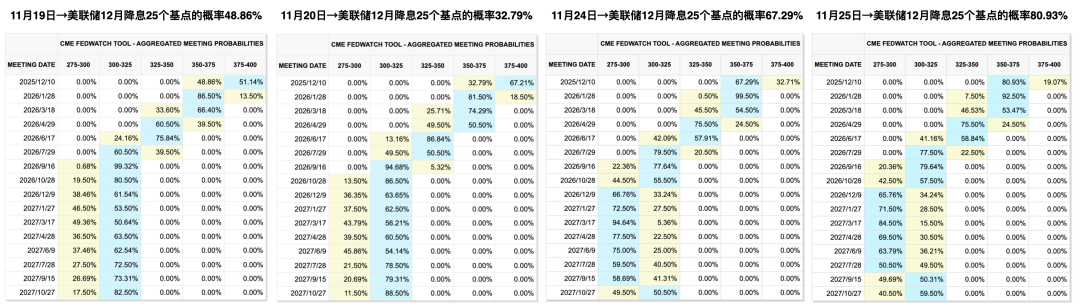 星河把最近几次降息的概率都列到了上面一张图里,可以看到12月10号降息的概率从上周四的32.79%升到了昨天的67.29%,今天进一步升到80.93%,似乎这次降息又十拿九稳了。