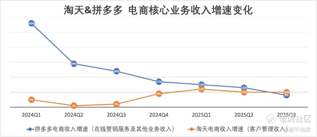 根据阿里巴巴Q3(公司2026财年第二季度,下同)业绩,代表淘天核心电商能力的客户管理收入(CMR)同比增长10%,而曾经以增速称霸行业的拼多多,Q3财报中披露的在线营销服务收入增速已降至8%。这是2018年拼多多上市以来,该指标首次落后于淘天。