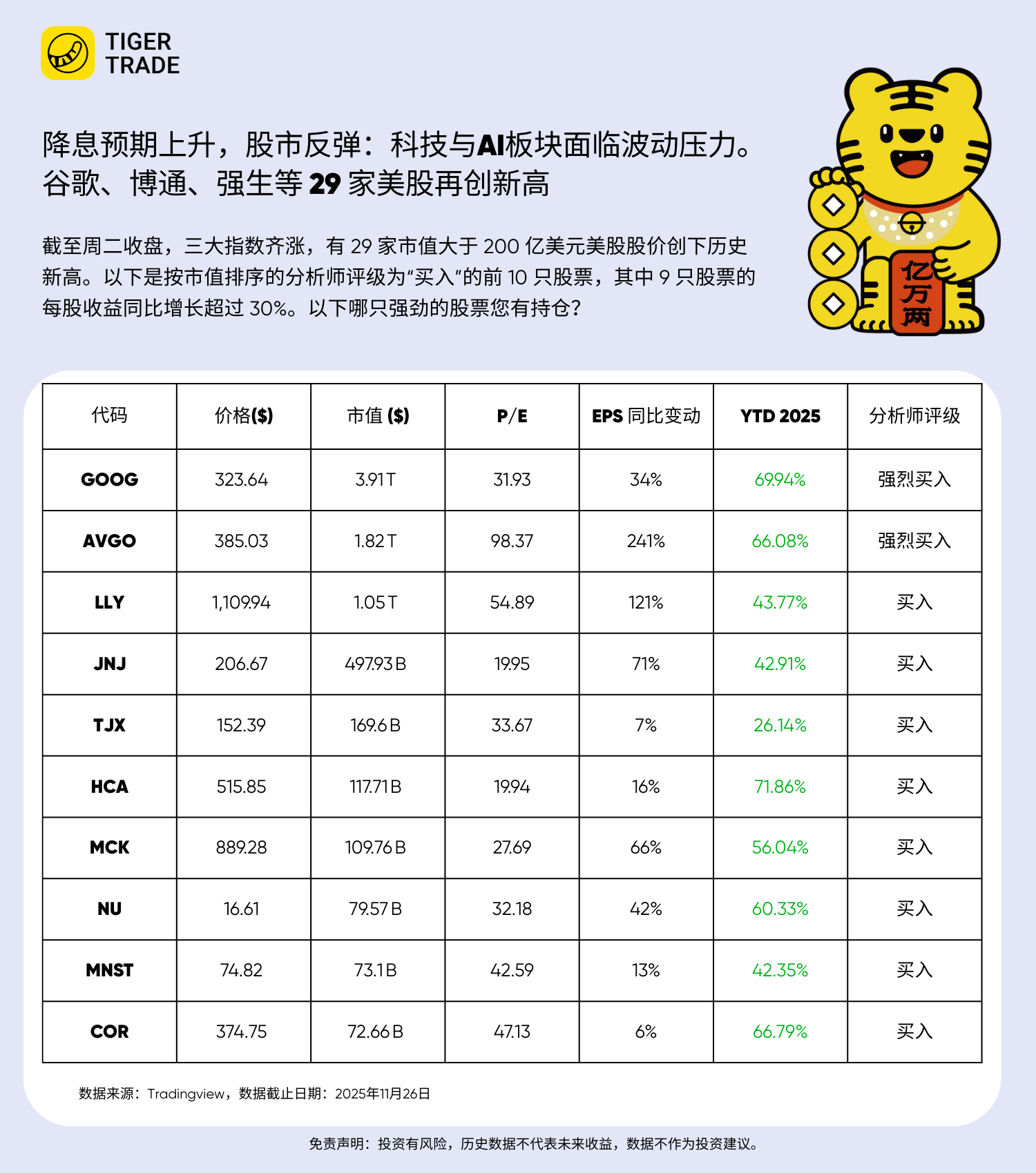 2025年11月25日,这些公司的股价创下历史新高。各行各业的主要公司在AI、制药和消费需求的推动下表现强劲。Alphabet实现了14%的年收入增长,达96.4亿美元,Google Cloud和AI实现了显著增长;Broadcom收入增长22%,主要得益于AI半导体;Eli Lilly报告收入增长54%,主要来自Mounjaro和Zepbound;Johnson & Johnson收入增长12%;TJX超出了预期,销售同比增长7%;HCA Healthcare受益于手术量增加;McKesson增长了16%;Nu Holdings收入增长39%;Monster Beverage实现了创纪录的销售;Cencora收入增长9.3%,并显示出强劲的美国运营收入增长。这些结果反映了技术、医疗保健、零售和诊断等行业的广泛增长,得益于创新、AI的应用和强劲的消费者需求。