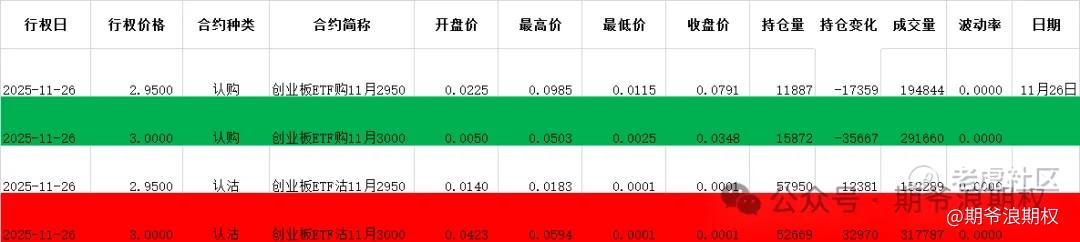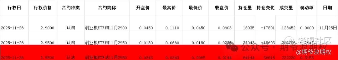 11月26日,大A所有ETF期权11月期权的最后一个交易日,创业板ETF11月3.0的认沽增仓3.3W张(下图红色仓位),大户继续骚操作。