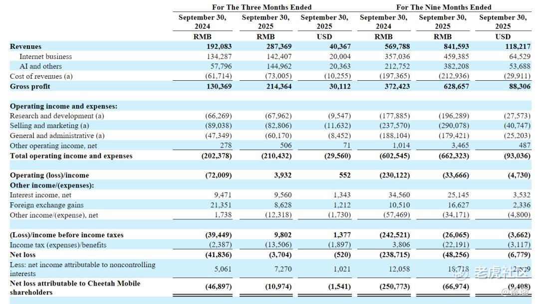 猎豹移动2025年第三季度营收为2.87亿元(约4040万美元),其中,互联网业务(Internet business)收入为1.42亿元,上年同期为1.34亿元;AI及其他业务收入为1.45亿元(约2036万美元),上年同期为5780万元。