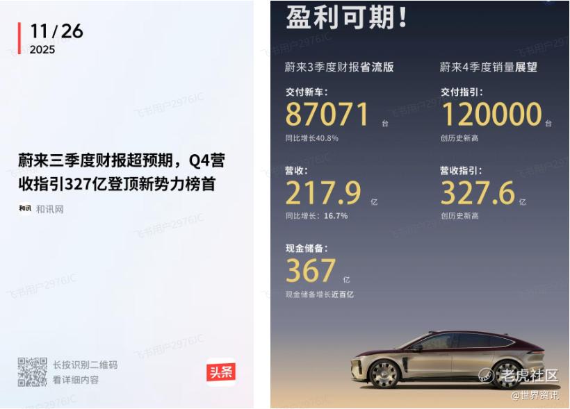 在2025年蔚来第三季度财报电话会上,蔚来不仅勾勒出Q4盈利路径,更抛出重磅信号:蔚来Q4营收指引锁定327.58 亿-340.39亿元,这一规模直接登顶新势力营收指引榜首,成为行业关注焦点。