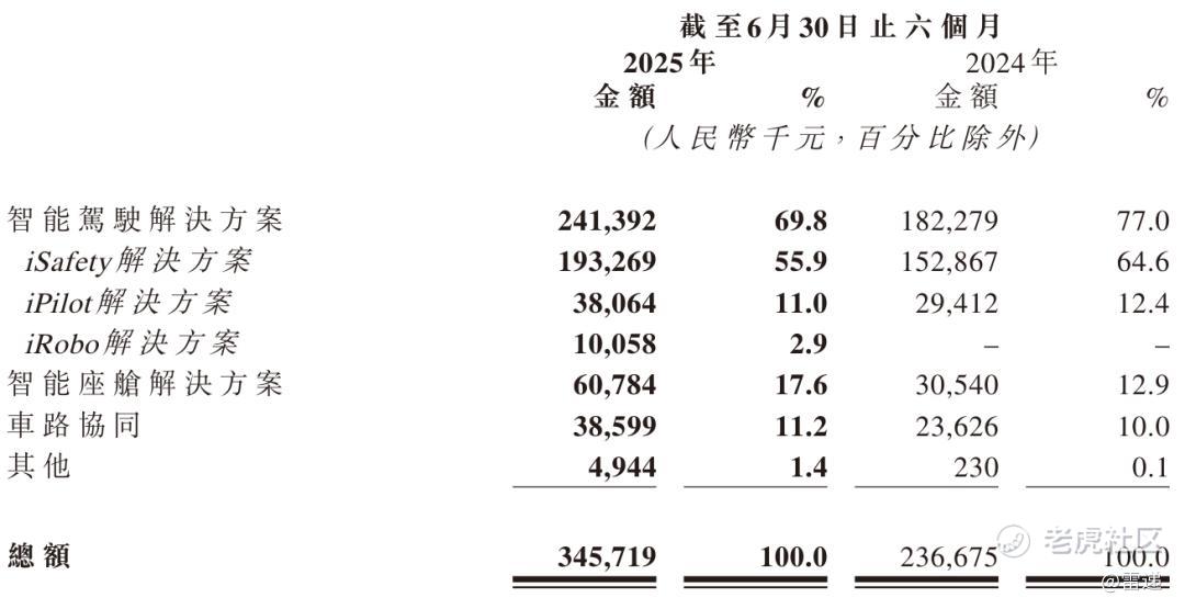 佑驾创新2025年上半年来自智能驾驶解决方案的收入为2.41亿元,占营收的比例为69.8%;来自智能座舱解决方案的收入为6078万元,占比为17.6%;来自车路协调的收入为3860万元,占比为11.2%。