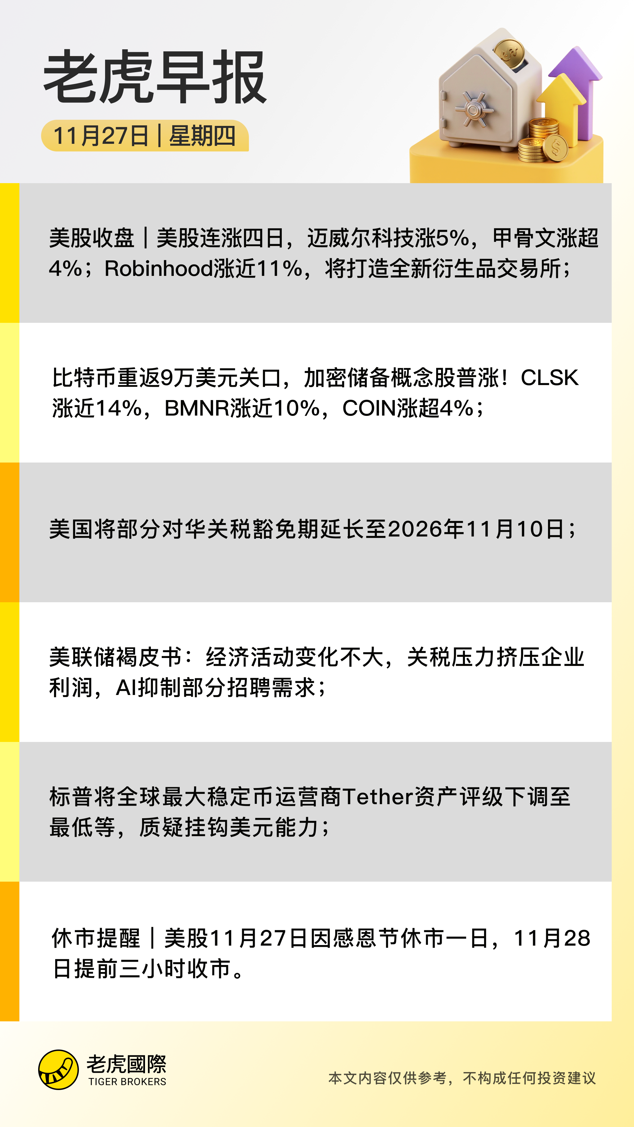 周三(11月26日),美股三大指数连涨四日。截至收盘,道琼斯指数涨0.67%,报47427.12点;标普500指数涨0.69%,报6812.61点;纳斯达克综合指数涨0.82%,报23214.69点。